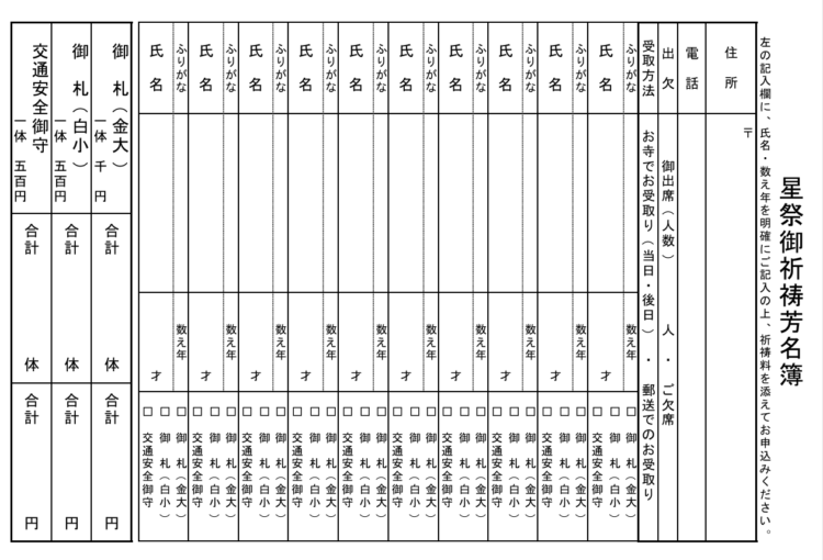 お申込みの際は、芳名簿に必要事項をご記入いただき、ご祈祷料を添えてご提出ください。